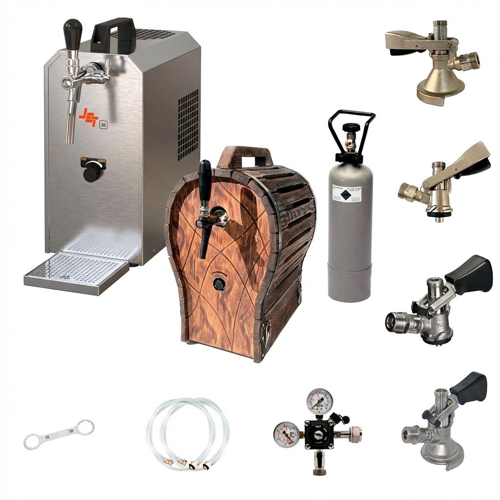 Komplett Set - Zapfanlage JET 30 Bierkoffer, Bierzapfanlage, Durchlaufkühler 1-leitig Trockenkühler, bis zu 35 Liter/h mit Holzfass