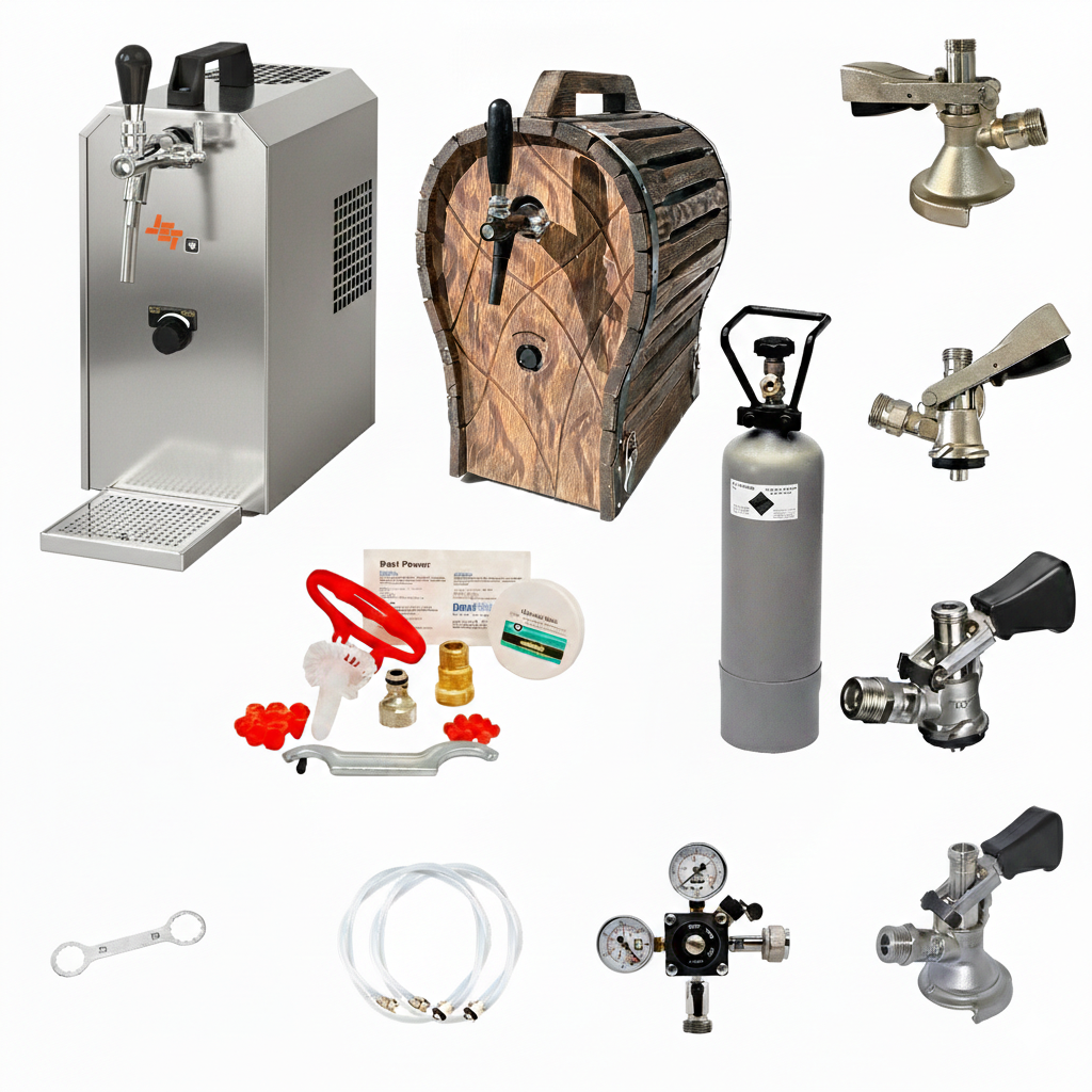 Komplett Set - Zapfanlage JET 30 Bierkoffer, Bierzapfanlage, Durchlaufkühler 1-leitig Trockenkühler, bis zu 35 Liter/h mit Holzfass, Reinigungsset für Zapfanlage und Keg